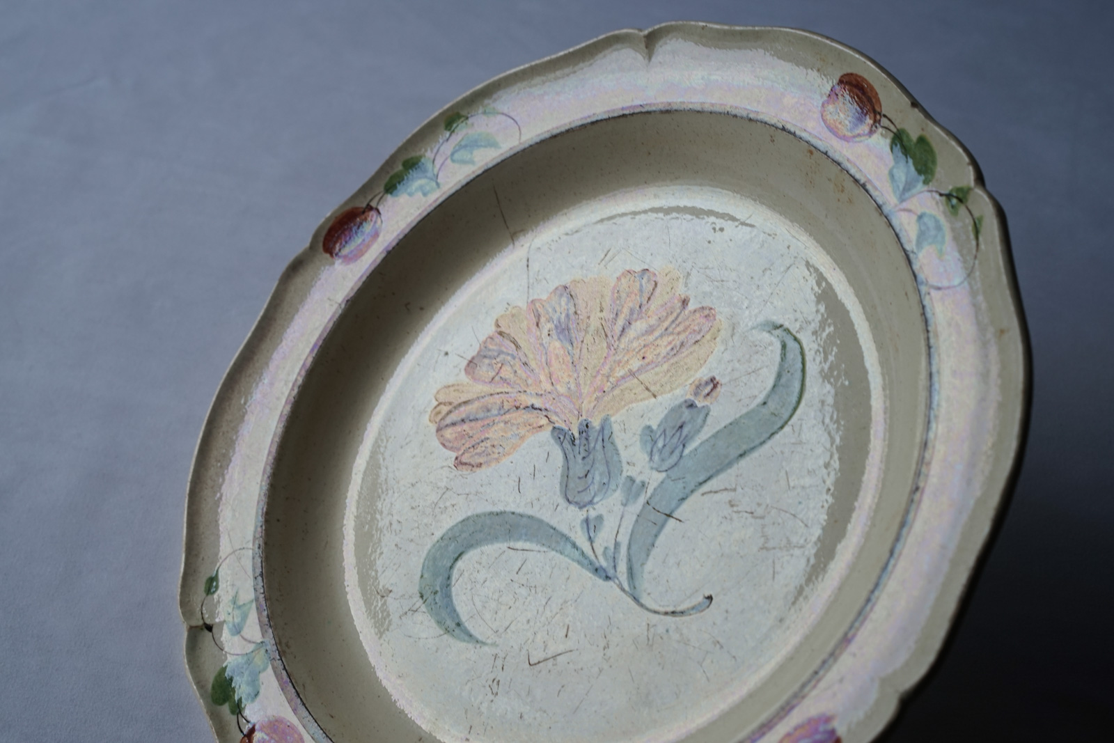 明るく大らかな花絵も魅力 使い込まれた花リム中皿 セミクルーズ