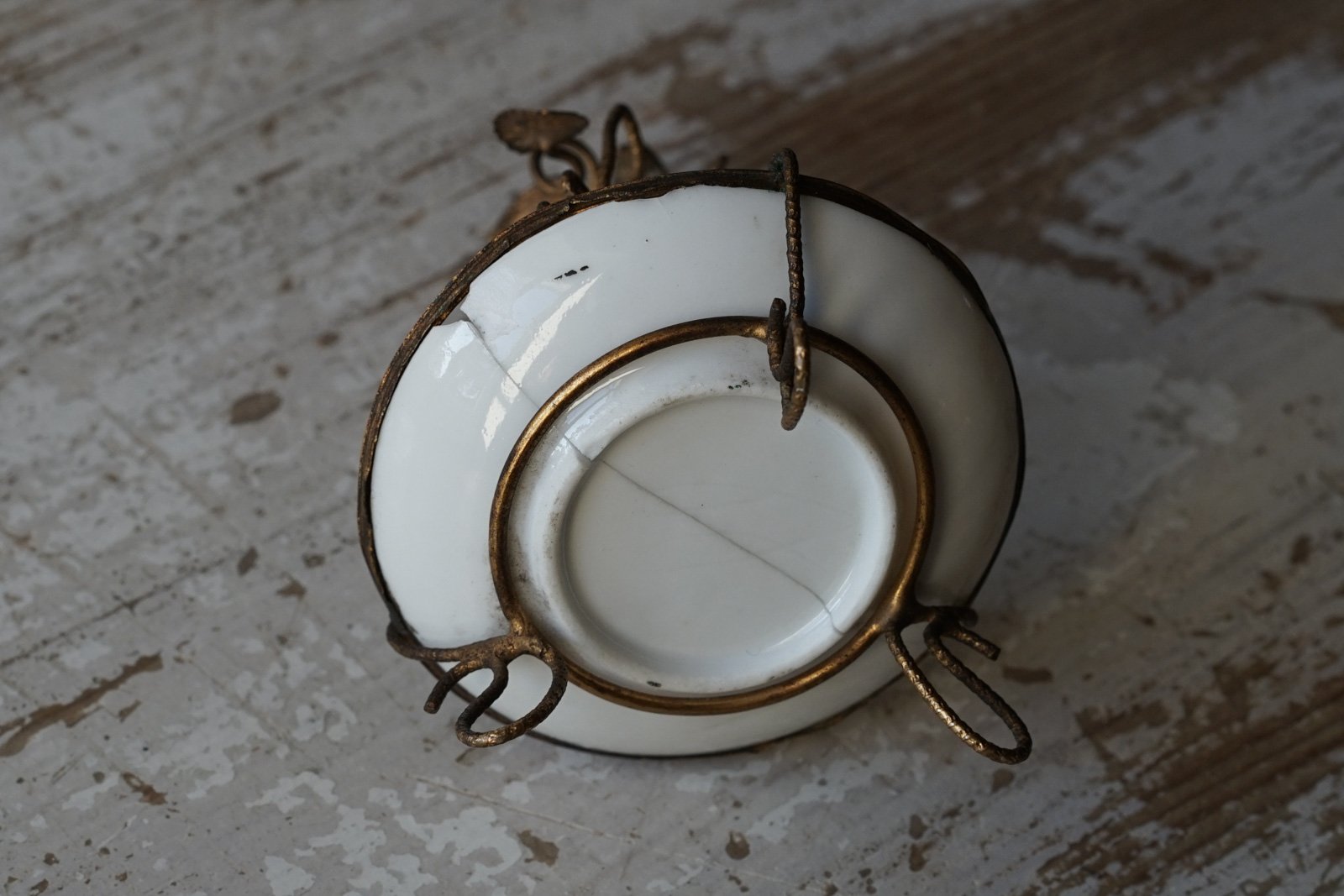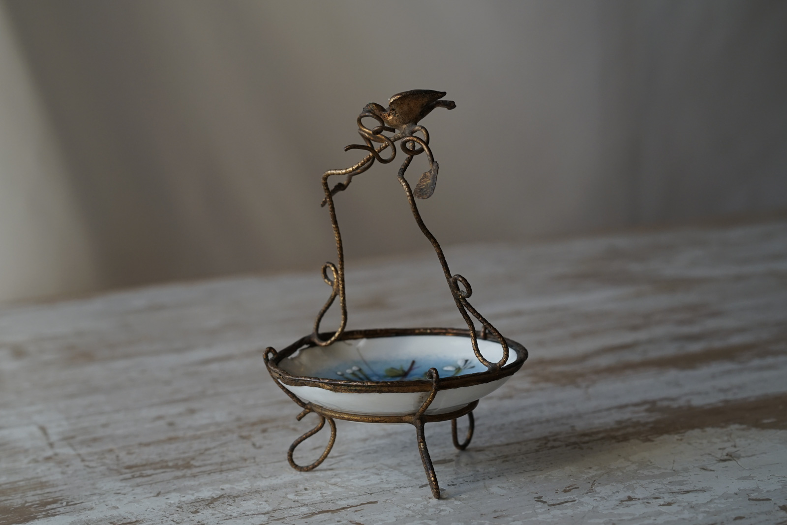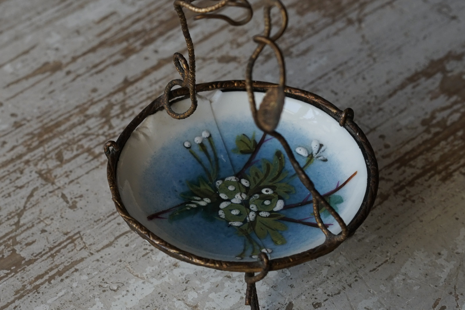 植物の絵が手描きされたポーセリンの小皿に 真鍮の鳥と葉がついた金具付のヴィドポッシュ