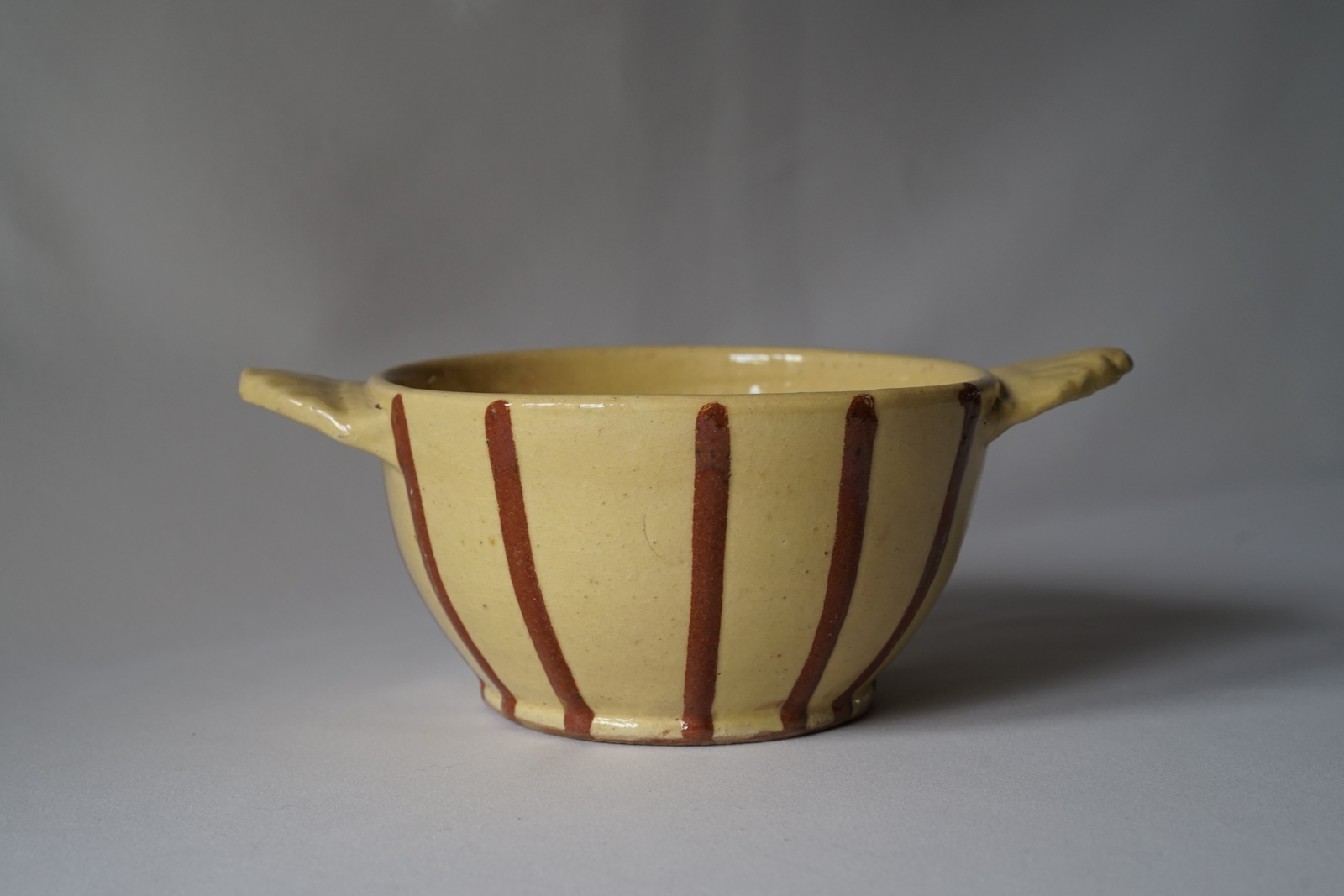 クリームがかった黄釉に茶の縦線文が入った 素朴な味わいの耳つきボウル