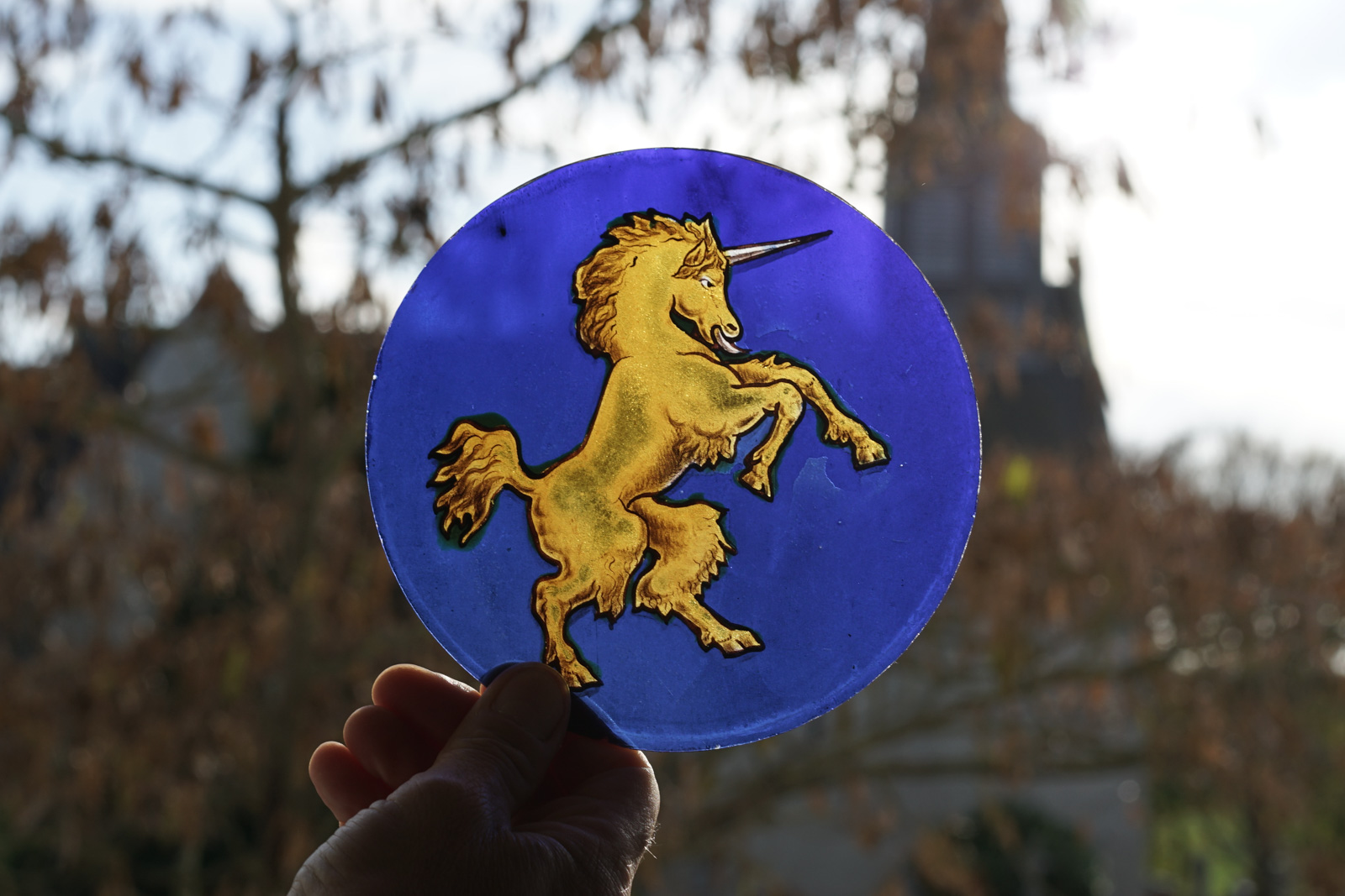 丸くカットされたガラスに ユニコーンが描かれた(エッチングされた)ガラス