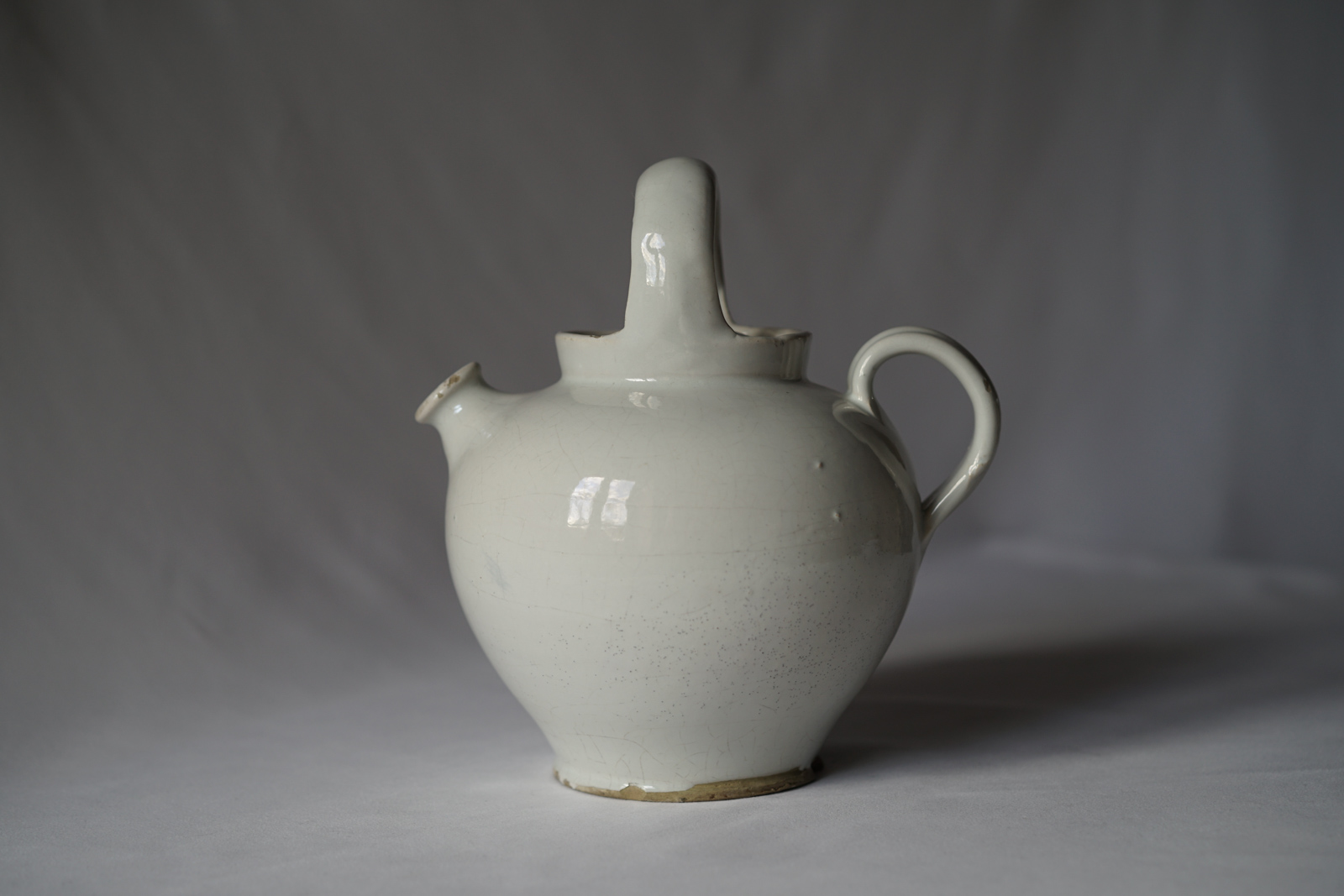 うっすら貫入のある青みと透明感のある白錫釉 部分的に鉄分が浮いています