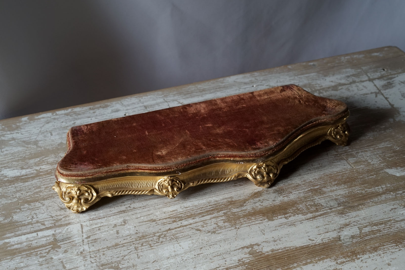 比較的軽い木に漆喰装飾と金彩 天板には赤みを帯びた茶のベルベットが貼られたディスプレイ台